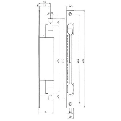 9221 espagnolet grendel met een RVS vlakke voorplaat van 285x22mm, doornmaat 35mm en stangaansluiting d.m.v. schroefdraad 10mm. Wordt geleverd exclusief espagnolet stang(en).