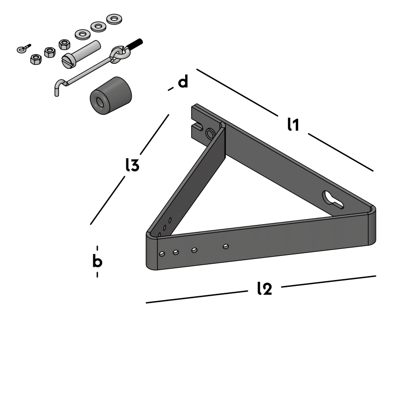De deuropvangbeugel wordt aan de wand gemonteerd en vangt de deur op bij het openen. De buffer beschermt deur en wand tegen beschadiging, de windhaakset houdt de deur in geopende positie vast. Geschikt voor aluminium, houten en kunststof kozijnen. Afmetingen: l1=275mm, l2=250mm, l3=220mm, b=40mm, d=4mm.