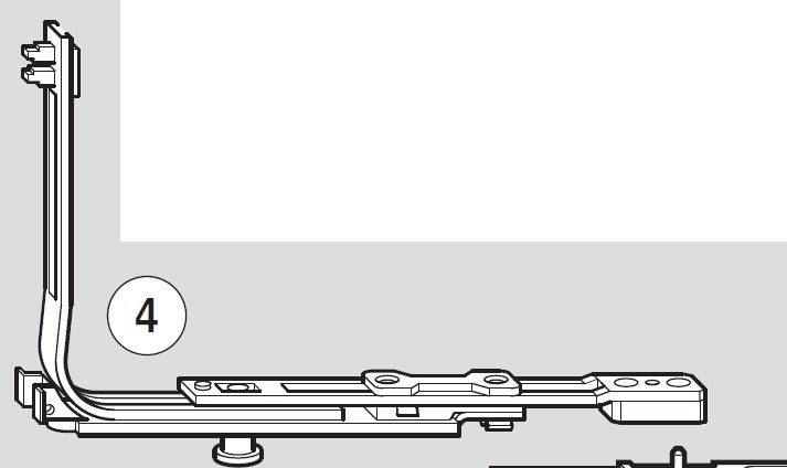 De ROTO NT hoekoverbrenger met V-nok vormt de verbinding tussen de espagnolet en het beslag aan de onderzijde van de sluitkant. Dit onderdeel geleidt de beslagstrip om de hoek van het vleugelprofiel en is voorzien van 1 V-nok als extra sluitpunt.