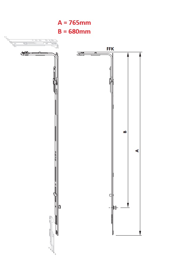 De Siegenia Titan iP/AF schaar-hoekoverbrenger BS/K3 GR.2 met 1 verstelbare sluitnok (1RS) heeft een lengte van 765mm en is ontwikkeld voor beslaghoogtes van 1201 tot 3000mm. Dit onderdeel maakt deel uit van het Titan iP/AF draai-kiepbeslagsysteem voor grotere raamformaten.