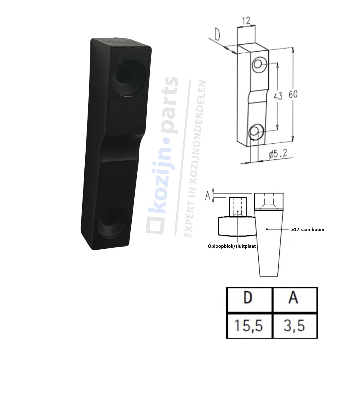 Het SOBINCO oploopblok/sluitplaat met een hoogte van 15,5 mm is een essentieel onderdeel voor de correcte sluiting van aluminium draairamen. Afgewerkt in de kleur zwart, is deze sluitplaat specifiek ontworpen om samen te werken met de 517 raamboom van Sobinco. De plaat geleidt de rolnok van de raamboom voor een soepele en veilige sluiting.